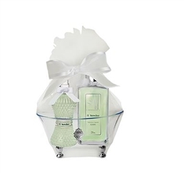 Embalado em tule. Contém: 1 Banheira clássica estilo vitoriana com pés cromados + 1 Sabonete Líquido Bamboo 250ml + 1 Aromatizador de Ambiente Bamboo 100ml . Frascos de vidro.