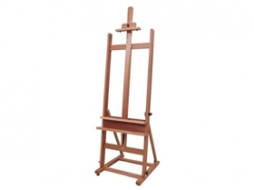 Prático cavalete de menor porte, com cremalheira. Suporte de tela com espaço para tintas, pincéis e acessórios. Suporta telas de até 1,00 m de altura. Possui em sua base 4 pés com regulagem de ajuste em pisos irregulares.