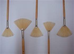 Pincel em forma de leque com cerdas chinesas brancas, cabo longo e virola prateada sem emenda. Ideal para pintura artística.